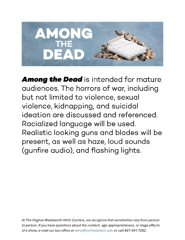 At The Virginia Wadsworth Wirtz Centers, we recognize that sensitivities vary from person to person. If you have questions about the content, age-appropriateness, or stage effects of a show, e-mail our box office at wirtz@northwestern.edu or call 847-491-7282.