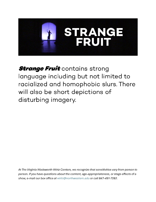 At The Virginia Wadsworth Wirtz Centers, we recognize that sensitivities vary from person to person. If you have questions about the content, age-appropriateness, or stage effects of a show, e-mail our box office at wirtz@northwestern.edu or call 847-491-7282.